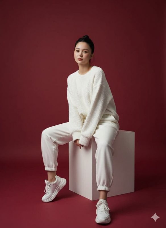 Prompt: “Stylish fashion editorial photo of this model wearing an oversized white sweatshirt and white sweatpants, paired with white sneakers. A soft red studio backdrop with soft cinematic lighting, highlighting textures, futuristic editorial style, model sitting elegantly, head slightly tilted, relaxed posture.”