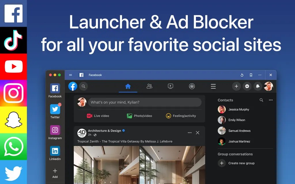– Tích hợp trình chặn quảng cáo để bạn có thể duyệt mạng xã hội mà không bị làm phiền bởi các quảng cáo phiền phức.